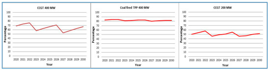 As opposed to the 400 MW CCGT, the coal-fired TPP had an even load factor over the years, primarily due to the fact that it had a strong priority in engagement to cover load diagram because of the variable cost of electricity production, e.g., fuel prices. As a case study, the CCGT of 200 MW was set to the same techno-economical characteristic as the one of 400 MW apart from its installed power and technical minimum. It was shown that the load factor for that thermal power plant was even because it was the thermal power plant of lower capacity, thus its relative oscillations of total generation were lower than with a combined gas-fired thermal power plant of 400 MW.