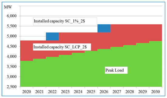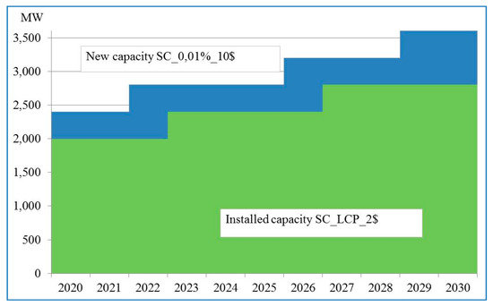 The comparison of scenarios with VOLL $2 USD/kWh and two levels of LOLP without limitations and with a limitation of 1% is shown in Figure 16. These two scenarios differed only in the dynamics of necessary realization in two years of the observed period. This was seen in the second half of the planned period in a way that one power plant was the candidate in the scenario with LOLP of $2 USD/kWh and was put into operation a year earlier than in the scenario without the limitation of LOLP. That meant that, in the group of scenarios with low outage costs, there was actually no difference between generation expansion planning using the method of LCP and the method of optimizing LOLP. The reason for this was that the influence or the share of costs referring to outage cost was almost negligible. These costs went from 0.3% for the scenario with LOLP 3% to 0.96% for the scenario without limitations of LOLP.