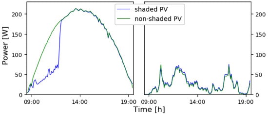 An example is shown in Figure 1, where the production of two identical neighboring solar panels with micro inverters are compared. One panel was shaded (blue line) in the morning. In the left plot, a day of clear sky conditions, the difference in the production due to the shadow is very obvious. On the other hand, the day after, on the right plot, under non-clear sky conditions, the difference in the production was negligible. Thus, shadow cannot be defined as pattern, since depending on the weather and the period of the year zero existence of shading induced reduction of power may occur for several consecutive days.