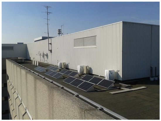 The proposed method was applied using data from the testing facility of SEAC (Solar Energy Application Center, Eindhoven, the Netherlands). Data from two PV systems of the facility are used, with identical panel structure (six panels in two rows, one front, one back, same tilt and orientation) and different inverter technology [,]. In Figure 2, a photograph of the system is presented. The used systems are the ones on the right-hand side, equipped with six micro inverters (265 W each) and the system on the left, equipped with six power optimizers connected in parallel (boost DC/DC) and a central inverter of 1.5 kW especially made for the power optimizer system. In front of each system a pole is placed (same dimension for every system) in order to create an artificial shadow on the front rows of each system during the day which is equal for all systems. Furthermore, DHI (diffuse horizontal irradiance), DNI (direct normal irradiance), and GHI (global horizontal irradiance) measurements are available, measured at Technical University Eindhoven, approximately 4.5 km from the testing facility and the GTI, in the plane of array, through two pyranometers mounted next to the PV systems.