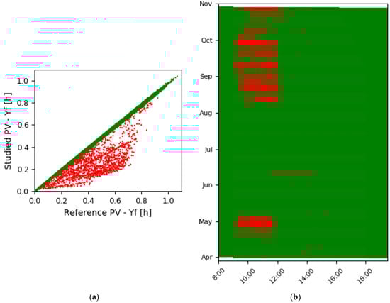 The data are clustered into inliers (green) and outliers (red), according to the algorithm []. (a) Scatterplot of studied panel vs the reference; (b) the green and red marked data points of (a) are plotted based on the date and time that they occur. Instead of power of the panels, their system yield is used, according to Equation (1).