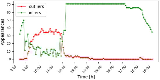 The time distribution of the outliers of Figure 3. The shadow profile is detected to occur between 9:00 and 12:20, where the presence of outliers (red line) is stronger from both the inliers (green line) and the average presence of the outliers during the day. The fact that inliers are detected as well during these hours is due to days of high diffuse irradiance.