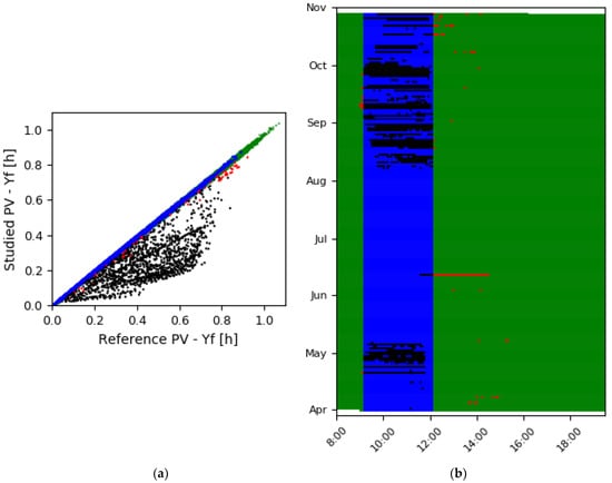 In Figure 6 step III is visualized. In the presented example, during step II, one shadow profile has been detected. In step III, only the days with high presence of shadow are used as input to DBSCAN, which is applied as many times as the detected shadows, one for the case of the example. In Figure 6a, the colored dots on the left of the plot are representing the dates which are used as input of DBSCAN and have been clustered in three different groups, as presented by the different colors. Dates which are not assigned in the group are characterized from DBSCAN as outliers and are not presented in the plot. In Figure 6b the result of applying DBSCAN is shown. Faults only within the dates recognized as shaded from DBSCAN are characterized as shadows. Especially the individual fault in mid-June is now characterized as malfunction (colored red) and not as shadow, as (part of it) in Figure 6a.