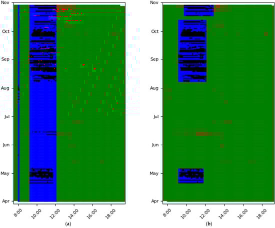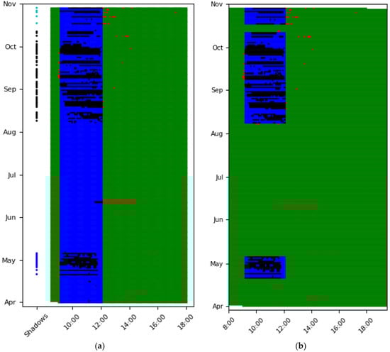 This example is slightly different than the previous one, since the day vs time scatterplot after the end of step II is presented as well (Figure 11a), together with the final scatterplot (Figure 11b). The purpose of these plots is to demonstrate the importance and the influence of step III and step IV in the process. After the second step, besides the pole shadow (from 9:30 to 12:00), the algorithm wrongly detects a small construction of outliers (from unknown reason) as shadow profile early in the morning between 15 and 30 July. Clearly, since the cause of these outliers is unknown and their duration short, they should not be characterized as shadow. That mistake is corrected in step III by means of the DBSCAN procedure. The shadow profile is deleted as the number of days the shadow is occurring was very few.