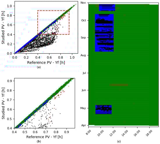 Final plots of the shadow story. (a) Plot of studied PV vs reference PV, showing fewer blue markers compared to Figure 5a; (b) zoomed-in of (a); (c) periods with high concentration of outliers are characterized as shadows (black markers), and periods with low concentration of outliers as malfunctions (red markers).