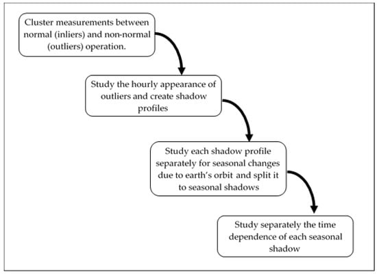 At the end of step II, any shadow profile(s) is detected. Thus, all the outliers outside the shadow profile(s) are characterized as malfunctions and within them, shadows. Furthermore, as can be seen in the example of Figure 4 and Figure 5, many inliers are within the shadow profiles as well and the explanation lies in the nature of the diffuse irradiance, as it is explained in Section 2.2.1.