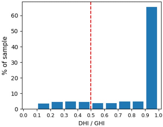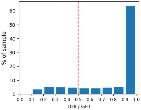 As depicted in Figure 7c, within the time intervals of the shadow story, there is a large number of measurements where an error is expected but not observed (blue markers). It can safely be assumed that this is due to high diffuse irradiance, which, in contrast with the direct, is not obstructed by the shade causing object, as explained in Section 2.2.1. In Figure 9, the ratio of diffuse to direct irradiance is presented in a histogram, only for the blue markers of Figure 7c. It is clear that for the strong majority of the measurements where the expected shadow is not observed, the DHI was the dominant irradiance component. For 82% of the measurements, the DHI was the dominant component, since its ratio to GHI was higher than 0.5 (on the right-hand side of the red line in Figure 8). Moreover, for 65% of the blue markers in Figure 7c, the DHI was more than the 90% of the GHI. Thus, the existence of the shadow in those cases is unfeasible.