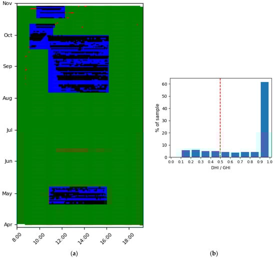 In Figure 10, the shadow story of this panel is presented and in Figure 10 the distribution of DHI to GHI ratio of the blue markers of Figure 10 is presented. The algorithm detected four different shadow profiles, two for each shadow. Furthermore, while the shadows coexist for a short period, from October 1 to October 12, from 10:50 to 11:10, the algorithm is able to detect them as separate shadow stories.