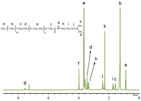 The structure elucidation of all gemini surfactants was done using 1H NMR, 13C NMR, FTIR, and MALDI-TOF MS. The structure elucidation of GS12 is illustrated here, while the data of GS8 and GS10 is given in Supplementary Materials (Figures S1–S8). The 1H NMR spectra of GS12 (Table 1, Figure 2) showed the existence of characteristic signals at δ 0.88 ppm and δ 1.25 ppm corresponding to the CH3 and CH2 moieties constituting hydrophobic tail. The presence of CH3 groups connected to the quaternary ammonium [–(CH3)2–N–(CH2)12–N–(CH3)2–] was evident from a singlet peak at δ 3.27 ppm [5]. The most intense peak at δ 3.65 ppm was attributed to the presence of the ethylene oxide chain (–O–CH2–CH2–O–CH2–CH2–) [31]. The singlet peak that appeared at δ 4.03 ppm was coupled with the CH2 group next to the carbonyl group [–CH2-CH2–O–CH2–C=O–NH–]. Characteristic signals at δ 7.98 ppm could be coupled to the proton of the amide group [–CH2–C=O–NH–CH2–] [32].