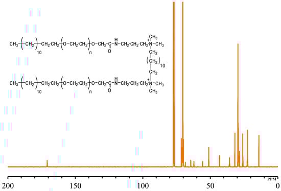 The 13C NMR spectra of GS12 (Table 2, Figure 3) displayed the signals at δ 14.0 ppm and δ 22.5–31.8 ppm related to the CH3 and CH2 groups constituting hydrophobic tail. The existence of CH3 groups joined to the quaternary ammonium [–(CH3)2–N–(CH2)12–N–(CH3)2–] was marked from signals at δ 51.1 ppm. In addition, characteristic signals at δ 62.1 ppm and δ 64.5 ppm correspond to the two CH2 groups at the quaternary ammonium [–CH2–N–(CH3)2–CH2–(CH2)10–CH2–(CH3)2–N–CH2–] [38]. The most intense peak at δ 70.4 ppm was attributed to the presence of the ethylene oxide chain (–O–CH2–CH2–O–CH2–CH2–) [31]. Characteristic signals at δ 170.8 ppm could be attributed to the carbon of the amide group [–CH2–C=O–NH–CH2–].