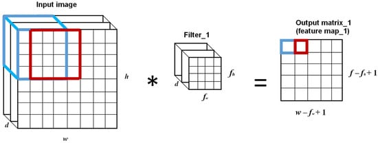 Technically, an image comes into the computer in the form of an array of pixel values with the dimension h × w × d, where h and w refer to the pixel numbers along the height direction and the width direction, and d refers to the number of color channels, which is equal to three for a common RGB color image. The convolutional layer extracts features from the raw image by reducing the input image’s size. There are many identical filters in a convolutional layer, and each filter is a relatively small matrix with the dimensions fh × fw × d. Generally, fh and fw are much smaller than h and w, while the depth of input image matrix and filter matrix should be the same. When an input image passes through a convolutional layer, it is convolved by each filter in this convolutional layer to yield a relatively small size output matrix called “feature map.” After all filters have finished the convolutions, the input image is converted into a relatively small matrix with a larger depth. The depth is equal to the number of filters in the convolutional layer, which should be determined by the user before image feeding. Figure 2 is a sketch map of the convolution operation of the image matrix with a single filter, wherein the stride (the number of pixel shifts operated by the filter over the image matrix) is equal to one. After convolution, the obtained feature map undergoes a non-linear operation by a non-linear function. Generally, the rectified linear unit (ReLU) is adopted in CNN for non-linear mapping [12] because of its faster computation and no requirement for unsupervised pre-training [13]. The ReLU function is expressed by Equation (1):