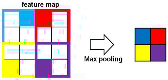 The function of the pooling layer is to reduce the dimensions of the feature maps obtained from the convolutional layer while retaining important information. In practice, three types of pooling methods are adopted in CNN: max pooling, average pooling, and sum pooling [14]. Figure 3 illustrates the max pooling process (the stride is equal to two) that selects the maximum number from the rectified feature map. The pooling layer can further reduce image dimensions while retaining key information. Depending on the size of the input image, the combination of convolutional layer and pooling layer may be repeated several times in a CNN.