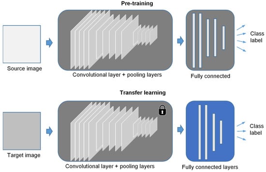 As shown in Section 2, the combination of convolutional layers and pooling layers in a CNN is used to convert a raw image to a flattened vector, which virtually plays the role of image feature extractor. The fully connected layer at the tail of CNN is a general multi-layer perceptron classifier. On the basis of this intuition, we imported a pre-trained CNN from a related task domain and removed the fully connected layers while retaining the convolutional layers and pooling layers. Then, we constructed the new fully connected layers for our own task. The new training process actually updated the parameters in this newly built fully connected layer, taking advantage of our relatively small database. Millions of weights and biases in convolutional layers and pooling layers were kept fixed in the new training process. Figure 4 is the flowchart of transfer learning in this study.