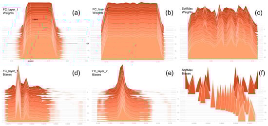 In this study, it took 460 s to train our CNN on a regular PC (an Internation Core i7 processor and no discrete graphics processing units). Figure 6 illustrates the change of distributions, both weights and biases, for each fully connected layer as well as for the SoftMax layer in the training process. Before training, the weights in each layer were randomly initialized according to a normal distribution (mean = 0, std = 0.5), while biases in each layer were initialized as zero. For each subfigure, the bottom axis represented the values of weights/biases, and the left axis reflected the number of epochs. For example, in Figure 6a, when the training process had proceeded 25 epochs, there were approximately 5 × 105 weights around the value of −0.01. In layer 1, the weights followed a plateaued normal distribution, where most weights were concentrated in the range [−0.02–0.02]. Layer 1 biases exhibited an obvious bimodal distribution, with the lower peak located near 0.0001, and the higher peak located near −0.0007. In layer 2, we still observed a normal distribution for weights, but with a wider plateau. The bias distribution changed from the bimodal distribution in layer 1 to the unimodal distribution, with a spike around 0.0001. For the SoftMax layer, the weights did not follow the normal distribution, but a distribution more analogous to a multimodal one. Biases in this layer exhibited two isolated mountain-like shapes in each epoch, since there were only two weights in the SoftMax layer. We can directly observe the values of two biases in Figure 6f.