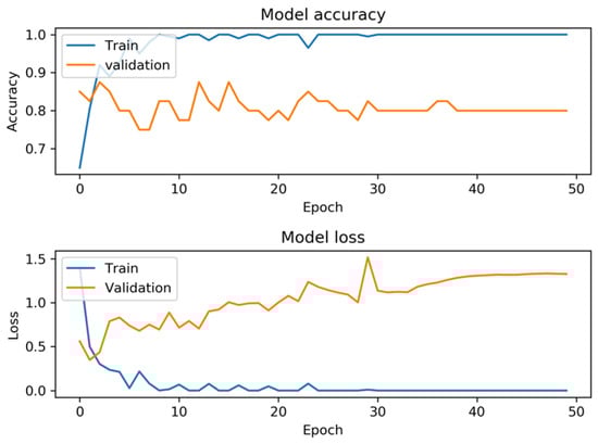 After 50 epochs of training, we plotted the model accuracy and model loss for both training samples and validation samples, as shown in Figure 7. It is worth noting that 40 validation samples were not involved in training, which meant they were never seen by our model. Not surprisingly, the training accuracy and training loss reached one and zero, respectively, as the training was completed. Validation accuracy experienced fluctuations in the first 30 epochs and stabilized after 30 epochs when, finally, the accuracy of 0.825 was achieved. Analogously, validation loss stabilized after fluctuation in the early training process. This figure also shows that the CNN converged after the 30th epoch, which confirmed the conclusion we obtained from Figure 6. Considering the size of the training dataset, 0.825 was an acceptable validation accuracy for our CNN. As indicated in the aforementioned analysis, if with more training images, the accuracy would be improved. Also, we tried tuning hyperparameters such as batch size, learning rate, and activation function to improve the model’s performance but achieved limited benefit. Therefore, in this study, increasing the training samples was the most effective and straightforward strategy to enhance our model’s performance.