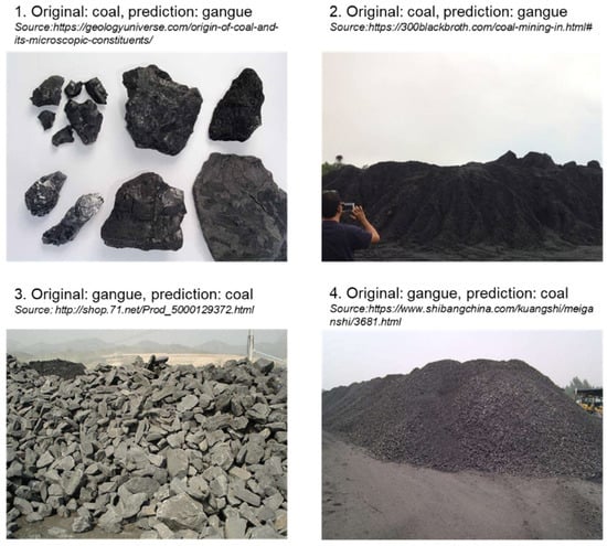 Different from current mainstream coal/gangue image reorganization technologies, CNN can extract image features by analyzing every image pixel, which avoids subjective and incomplete feature extraction. In this study, each input image was denoted by a 1 × 25,088 vector through a series of convolution and pooling implementations which, to a large extent, retained the image’s characteristics. Image reorganization using a CNN has no special requirement for image features such as the size of the object in the image, photography location, and light intensity. As shown in this paper, our training data were from many sources, including internet and published papers. This property of the CNN can guarantee the easy collection of training images, which virtually enhances the generalization of the CNN. No explicit discriminate standard for image recognition exists in the CNN model, which could improve the model’s flexibility in dealing with some ambiguous materials like the materials of this study.