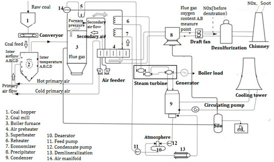 Flue gas is extracted from the boiler through the appropriate exhaust fans. The flue dust is separated from the electrostatic precipitate after exhausting flue gas into the atmosphere via an 80m high stack. The bottom ash (slag) and the flue dust are disposed of via the hydraulic system and transported through the pipelines to the landfill. When the furnace flame temperature rises above 900 °C in the boiler combustion process, the coal undergoes thermal decomposition and is further oxidized into NOx, accompanied by the reduction reaction of NOx. The producing and reducing NOx are not only related to the characteristics of coal, the state of NOx in coal, the distribution ratio of nitrogen in volatile and coke during nitrogen thermal decomposition of coal and their respective components, but is also related to the oxygen concentration and combustion temperature. The NOx produced by the coal combustion in the boiler is discharged from the chimney into the surrounding environment. It could be harmful to the atmosphere and the environment. Moreover, the boiler load leads to unsafe boiler running and a low fuel utilization ratio. Therefore, the operation variables should be controlled to achieve the optimal boiler combustion efficiency under the NOx emissions and boiler load constraints. It leads to an interesting research area.