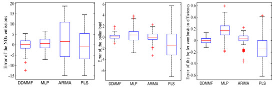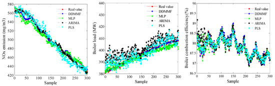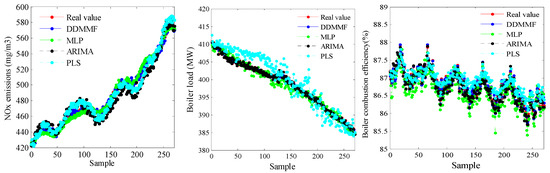The prediction accuracy of the DDMMF model was better than the corresponding one obtained with the MLP, ARIMA and PLS models. For example, in case of operating condition 1 compared with the other predictive models, the MAE indicator of the DDMMF model for the NOx emissions prediction reduced by 0.391%, 33.685% and 26.885%, respectively; the RMSE indicator was diminished by 4.753%, 52.331% and 15.009%, respectively; and the MARE indicator decreased by 48.320%, 74.557% and 83.602%, respectively. The runtime of the comparison models was 46.426 s, 52.678 s and 38.124 s, respectively. And the runtime of the DDMMF model was only 27.844 s. In this case, the MAE indicator of the DDMMF model for the boiler load prediction decreased by 88.928%, 73.028% and 67.557%, respectively; the RMSE indicator reduced by 23.228%, 73.028% and 28.179%, respectively; and the MARE indicator decreased by 51.754%, 61.357% and 19.373%, respectively. The runtimes of the comparison models were 40.128 s, 43.324 s and 38.421 s, respectively. The runtime of the DDMMF model was only 30.564 s. Similarly, for the boiler combustion efficiency, the MAE of the DDMMF model reduced by 96.551%, 99.715% and 99.896%, respectively; the RMSE diminished by 63.318%, 40.707% and 35.653%, separately; and the MARE decreased by 62.630%, 94.816% and 93.517%, respectively. The runtimes of the other models were 36.345 s, 32.157 s and 38.657 s, respectively. The runtime of the DDMMF model was only 25.625 s. Similar results were obtained for operating condition 2, the MAE indicator of DDMMF model for the NOx emissions prediction diminished by 19.343%, 71.906% and 44.512%, respectively; the RMSE indicator reduced by 78.628%, 88.887% and 90.123%, respectively; and the MARE indicator decreased by 82.696%, 68.832% and 86.545%, respectively. The runtimes of other models were 36.175 s, 38.620 s and 32.265 s, respectively. The runtime of the DDMMF model was only 28.658 s. For the same operating condition and boiler load prediction, a 88.928%, 73.028% and 67.557% decrease in the MAE indicator of DDMMF model, a 23.228%, 73.028% and 28.179% decrease in the RMSE indicator and a 51.754%, 61.357% and 19.373% decrease in the MARE index was obtained, respectively. The runtimes of the comparison models were 34.659 s, 33.674 s and 35.658 s, respectively. The runtime of the DDMMF model was only 29.467 s. Finally, the boiler combustion efficiency prediction showed a 85.998%, 83.661% and 67.915% reduction in the MAE indicator of the DDMMF model, 84.067%, 51.682% and 30.702% decrements in the RMSE index and a 82.196%, 59.790% and 72.201% reduction in the MARE index, respectively. The runtimes of other models were 48.554 s, 52.214 s and 43.248 s, respectively. The runtime of the DDMMF model was only 19.248 s. The results of the present study indicate that the algorithm improved of the modeling accuracy and counting efficiency.