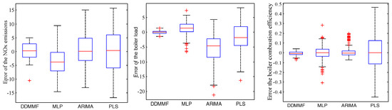 In this section, the approach DDMMF is proposed as the predictive model in this paper, the prediction performance of the proposed model is compared with the ARIMA model in Reference [5], the PLS model in Reference [7], and the MLP model in Reference [10]. In the first case, the predicted results of the proposed model for operating condition 1 are compared with the corresponding ones obtained from the MLP, ARIMA and PLS models. The predicted values for the boiler combustion efficiency, the NOx emissions, and the boiler load for different prediction models are shown in Figure 3, while their corresponding prediction errors are compared in Figure 4. The evaluation indicators obtained for these predicted values are compared for various prediction models. These comparative results are given in Table 4. The predicted values for operating condition 2 are compared in Figure 5, while their corresponding prediction errors are given in Figure 6. Table 5 compares the prediction evaluation indicators for operating condition 2.