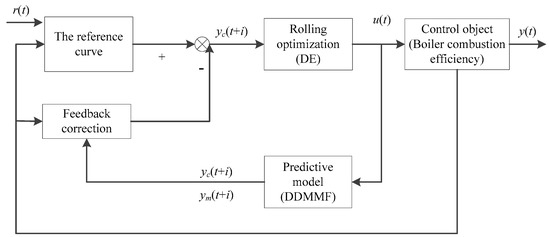 The MPC algorithm consists of the prediction model, rolling optimization and feedback correction as shown in Figure 7. The LSSVM-based prediction model is optimized via the DE algorithm. Predictive models are provided for the NOx emissions, the boiler load, and the boiler combustion efficiency to predict the boiler combustion efficiency under the NOx emissions and the boiler load. Historical data and current production information are employed to predict the relevant object values at the current time. Then, the prediction information of the DDMMF is adopted to establish rolling optimization. The optimal controller parameters are obtained by solving this rolling optimization problem. This gives maximum boiler combustion efficiency under the NOx emissions and the boiler load constraints. Feedback correction is utilized to improve the proposed model accuracy.