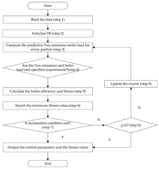 The LSSVM is adopted to construct the predictive model while the DE algorithm is utilized to find the optimal parameters of the LSSVM. The boiler load, NOx emissions and boiler combustion efficiency are divided into the H group data under the classified working conditions, then step 1 to 6 is executed, respectively. Each set of data represents a class of working conditions. The flowchart of the DE-based LSSVM (DELSSVM) algorithm is shown in Figure 2. The measurement models under corresponding working conditions are established by using the DE algorithm to the optimal LSSVM method. A description of the relationship between the input parameters and the boiler major parameters is given below: