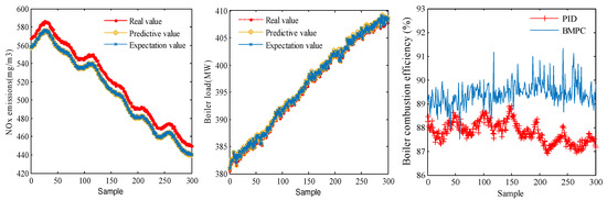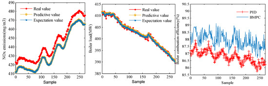 In this study, the model predictive control strategy is employed to maximize boiler combustion efficiency under two operating conditions. To verify the proposed method performance, some experiments were performed using the real production data. The data sets under the two operating conditions are described in Table 7. The experimental results are given in Figure 9 and Figure 10. The obtained results under the first and the second operating conditions are shown in Figure 9 and Figure 10, respectively. Figure 9, Figure 10, and Table 7 demonstrate the superiority of the proposed model predictive controller (BMPC) to the proportion-integral-derivative (PID) controller. The as seen in Figure 9 and Figure 10, with the model predictive control algorithm using in the boiler, it could be concluded that the NOx emissions control output values and boiler load control output values when the control variables were reasonably matched, which could follow the trajectory of a given curve better. In combination with Table 7, the boiler efficiency could be improved by adjusting the control values, when the NOx emissions control output errors and the boiler load control output errors were both within ±5% under the two different operating conditions. The control output error was between the predicted value under the optimal variable and the expected value. The NOx emissions and boiler load were the predicted output values of the test data using the DDMMF method. The expected values of boiler efficiency were the actual values plus a 1.5% smoothing filter, the expected values of the NOx emissions were the actual values minus 10, and the expected values of the boiler load were the actual output values. We can see from Table 7, the proposed approach compared with the PID controller could improve boiler efficiency by 1.613 percent and reduce NOx emissions by 1.887 percent for the first operating condition. In addition, it could improve boiler efficiency by 1.136 percent and reduce NOx emissions by 2.166 percent for the second condition, when the control variables satisfied the boundary constraints and the NOx emissions control output error and boiler load control output error were both within ±5%. Thus, based on the boiler key parameter model (NOx emissions, boiler load, boiler efficiency), the boiler combustion efficiency rolling optimization model was constructed by considering load constraints, pollutant emission constraints and boundary constraints, and the optimal controller parameters were calculated via an optimization model solved by the DE algorithm. Finally, the proposed BMPC provided effective tools for the operators.