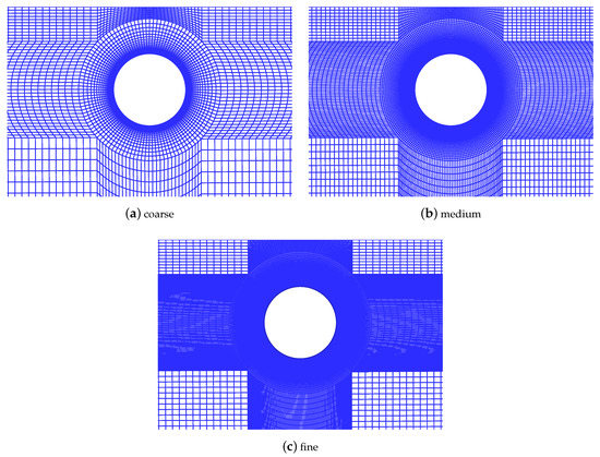 Different coarseness of body-fitted grids around the cylinder.