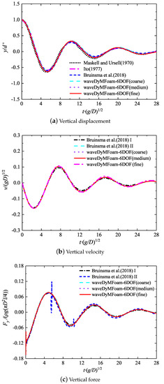 To reveal the effects of boundary layer around the cylinder and capture other relevant details, the body-fitted grid was used to perform the discretization of the solution domain. As displayed in Figure 2a–c, three grids with different levels of fitness on the periphery of cylinder were designed, respectively, named coarse, medium and fine, to verify the mesh convergence. Specially, the vertical displacement, vertical velocity, and vertical force acting on the heaving cylinder during the attenuation process were focused on when comparing with the previous results, and the corresponding results are presented in Figure 3. Overall, it can be concluded that the waveDyMFoam-6DOF solver can well demonstrate the time-varying process of vertical displacement, vertical velocity and vertical force of the horizontal cylinder in the process of water entry at an initial deviation position. Moreover, the present simulated results for three grids are all in good correspondence with the experimental [31] and theoretical [32] results, and the numerical results [33]. It is worth mentioning that the instability of the dynamic grid technique usually occurred due to the velocity/pressure oscillations. In the present simulation, no obvious discrepancies were observed for the vertical velocity, and no force oscillation occurred except there existed a clear force fluctuation at the start point.
