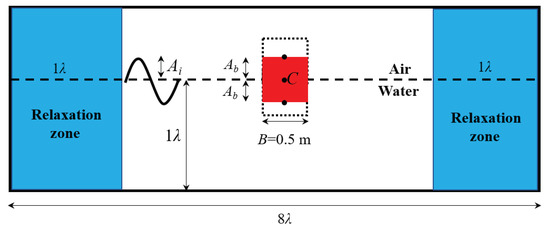 The simulation of the heave response of a box excited by regular waves were validated against the analytical results by Maruo [34], physical model tests by Nojiri [35], and numerical results by Koo and Kim [36] and Luo et al. [37]. Keeping the same geometric parameters as Luo et al. [37], the schematic diagram of the heave-only box interacting with incident waves is shown in Figure 4, where is the wavelength, the incident wave amplitude, the heave response amplitude deviating from the still water level, and B the breadth of the object.