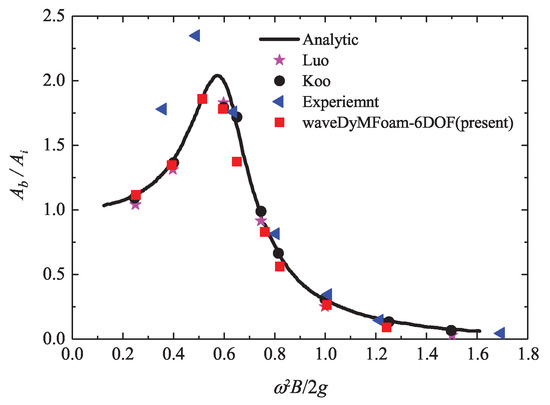 As shown in Figure 5, the relative heave amplitude / as a function of dimensionless wave frequency (where, is the angular frequency) was compared to the previous results [34,35,36,37]. Generally speaking, the present results predicted by waveDyMFoam-6DOF solver are in good accordance with analytical and numerical results, except around the system resonance frequency, which further validated the feasibility and restrictions of the dynamic mesh technology in this paper. Moreover, the interaction between waves and floating objects (such as heave-only OWCs) can be accurately simulated.