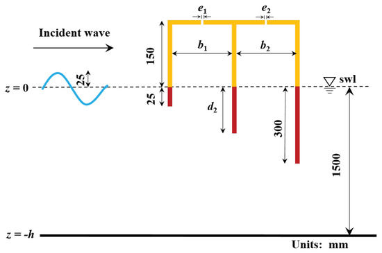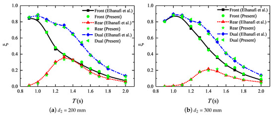 The emphasis of this study was to predict the energy-conversion performance of the coupled OWC system, thus it was crucial to validate the calculations of wave energy conversion efficiency against the previous results. Fortunately, by using the commercial software Star-CCM+, Elhanafi et al. [18] investigated the hydrodynamic performance of a dual-chamber offshore-stationary OWC device, as depicted in Figure 6. Some constant parameters are presented in the graph, i.e., incident wave amplitude (), water depth (), and freeboard (). The draughts of the front and rear walls are 25 and 300 , respectively. Two draughts of the mid-wall are chosen: 200 and 300 mm. The slot opening ratios for the front () and rear chambers () are both 1.67%, and the tested wave periods (T) range from 0.9 to 2.0 s.
