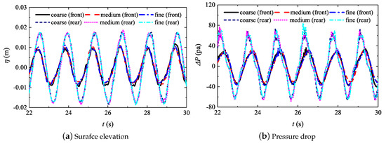 Convergence tests of surface elevation and pressure drop in the front and rear chambers for grids with different resolutions.