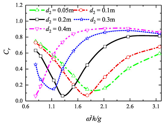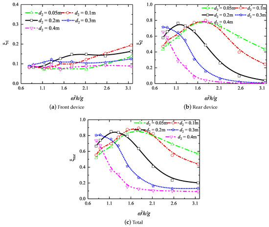 Figure 14 illustrates the effects of the back-wall draught on the reflection coefficient (which is defined by the ratio of the reflected wave height to the incident one). It further demonstrates that increasing the draught could prevent more of the wave energy from transmitting into the rear OWC, and cause the total-reflection frequency to shift to the low wave-frequency area.