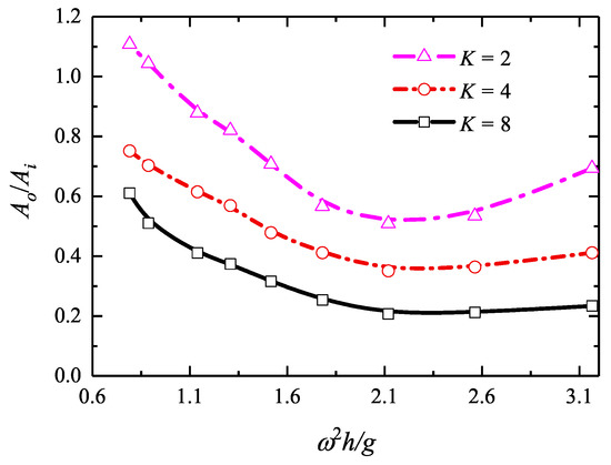 The effects of the non-dimensional spring coefficients K on the efficiency of the rear fixed OWC device are described in Figure 16b. Although the spring force was not directly imposed on the rear device, the influence could not be ignored. For the intermediate- and long-wave regimes tested, the efficiency reduced with increasing the spring stiffness. As for the total efficiency shown in Figure 16c, the completely inverse variation was observed compared to that in Figure 16b. From the perspective of highly-effective operations, a larger non-dimensional spring coefficient is more beneficial. However, although a completely stationary marine structure is more satisfactory, the corresponding construction cost is high and the feasibility is quite low. Therefore, the non-dimensional spring coefficient 8 was chosen for the following simulations.