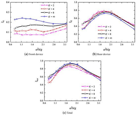 In practice, the offshore structure is almost impossible to be fixed on the water surface, especially for the heave motion. Next, the effects of the non-dimensional spring coefficient K (representing the vertical restraint force) defined by Equation (12) on the hydrodynamic efficiencies, such as the front, rear and total efficiencies, were examined. Invoking the previous findings, the present geometrical configuration was updated as follows: m, m, and m. Additionally, four different non-dimensional spring coefficients K, namely 2, 4, 8 and ∞, were considered. It is noted that the front OWC device was fixed as .