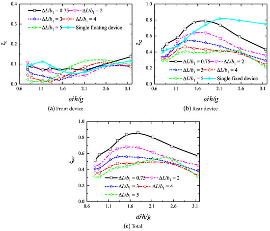 In Figure 18a–c, the variations of the hydrodynamic efficiencies against the dimensionless frequency for five different intervals in the long-interval regime are illustrated. For comparison, the results of the single OWC devices are presented as well. Physically, when the gap was larger than half of wavelength, the standing wave was formed in between the two devices. As a result, more energy was dissipated due to the multi-transmission processes, and some of wave energy was entrapped in the water column bounded by these two devices. It was expected that multiple peaks of the efficiency curves occurred in the tested frequency range. Moreover, with increasing the gap, the peak frequency shifted to the low frequency area. For the total efficiency, the widest bandwidth of the efficiency value larger than was in the range of as .