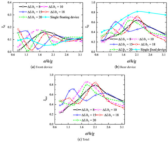 Figure 11e shows the variation of the front extraction efficiency against the dimensionless wave frequency . The curves have multiple peaks with increasing , which was due to the existence of multiple resonance mechanisms (such as the two water columns and heaving-free structure) [17,37]. However, for the stationary device, the efficiency curves shown in Figure 11f have only one peak for all the chamber widths, which means that, except for the resonance of the rear OWC, the effects of the other resonance mechanisms were negligible. By comparing the peak values in Figure 11e–f, it can be concluded that the majority of the total extracted energy was contributed to the rear device, while the energy extracted from the front was only a good complement. It is worth mentioning that, for , the energy extracted from the front device reduced by about 37% compared to the case of , whereas the energy from the back was almost equivalent. Moreover, it was demonstrated that the inside free surface displacement significantly determined the extraction efficiency (a similar conclusion was presented by Ning et al. [19]).