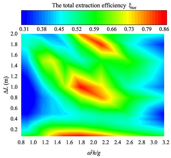 Finally, the contour of the total conversion efficiency as a function of and is plotted in Figure 19. It was found that a relatively small interval was more beneficial for the highly-effective extraction over a wider wave-frequency range.