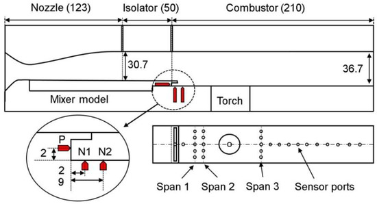 The rectangular duct-type supersonic combustor model was composed of a Mach 2 half nozzle and a discontinuous rectangular duct, as shown in Figure 1. The isolator was 50 mm long and 30.7 mm high, and the combustor was 210 mm long and 36.7 mm high. The pressure ratio between the isolator inlet and outlet was 2:1 and designed using Billig’s formula [3]. Air in the laboratory room was drawn into a vacuum tank of 5 kPa and then accelerated through the Mach 2 half nozzle. The unit Reynolds number of the mixer model was about 6.6 × 105 per meter. Hydrogen gas was used as an injectant. There were three injectors: a parallel injector (P), a normal 1 injector (N1), and a normal 2 injector (N2). A detailed description of these injectors is shown in Figure 1.