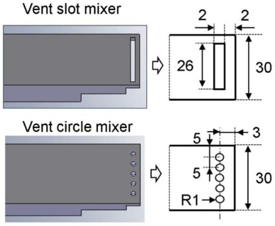 The mixer models were attached to the lower wall. Two new mixer models were employed; one was a vent slot mixer (VSM), and the other was a vent circle mixer (VCM). The step mixer is generally chosen as the mixer model for a supersonic combustor owing to its simple structure, however, it has poor mixing performance in the recirculation region behind it. To enhance the mixing performance, the vent mixer was developed to actively provide air into the recirculation region behind the step mixer. The configuration of the vent mixers is shown in Figure 2. The vent mixer had an extended block from the step wall, which was 6 mm long and 2 mm thick. To supply the main air into the recirculation region, a slot or several circular holes were perforated in the extended block. The VSM had a slot and the VCM had circular holes, and these are detailed in Figure 2. The slot and circular holes were selected to compare the difference between the two-dimensional inflow of the slot and three-dimensional inflow of the circular holes in the recirculation region.