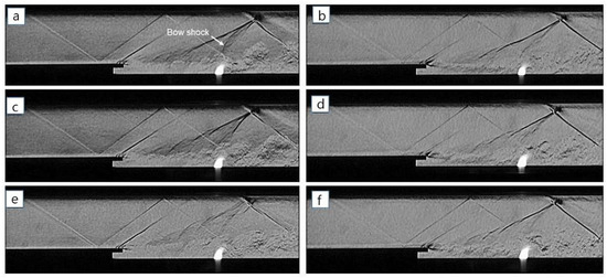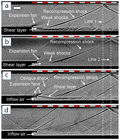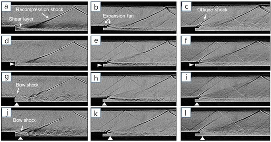 The step mixer has a simple structure to hold the recirculation region behind it, but there is little stirring in this recirculation region. The upstream flow is separated at the edge of the step, and then the flow path is expanded, inducing an expansion fan and shear layer downstream, as shown in Figure 3a [6,16]. A recompression shock is developed from the slope of the shear layer. From the step mixer, a 2 mm thick and 6 mm long block is extended from the step wall. There is a cavity under the extended block. The expansion fan and the shear layer can also be seen in Figure 3b. Compared with the step mixer in Figure 3a, the position where the recompression shock collides with the upper wall moves downstream in Figure 3b. This movement length is about 6 mm, which coincides with the length of the extended block. The extended block plays a role in extending the recirculation region and has little effect on the flow structure development. To provide the main flow into the recirculation region, several holes were perforated into the extended block surface. In Figure 3c, inflow air through the holes seems to be observed under the extended block. This inflow air stirs the recirculation region, leading to a fluctuating shear layer; weak shocks can be seen from the shear layer [16]. To increase the inflow air into the recirculation region, a slot was made in the extended block, as shown in Figure 3d. Compared with the flow structures around the shear layer in Figure 3c, weak shocks are clearly observed, and a recompression shock is created far from the shear layer surface in Figure 3d.