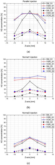 Hydrogen gas concentration distribution for injection locations: (a) parallel injection, (b) normal 1 injection, and (c) normal 2 injection (SM—step mixer, VSM—vent slot mixer, VCM—vent circle mixer, S1—span 1, S2—span 2).