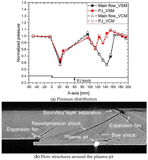 Figure 6a shows the effect of the PJ used as the hot source in the flow field. Without the PJ injection, the pressure drops sharply in the expansion region behind the vent mixer and the pressure recovers through the recompression shock. The downstream pressure behind the PJ torch shows a large up and down pattern, because the recompression shock also moves toward the downstream region. When the recompression shock collides against the upper wall, the boundary layer is separated, leading to expansion fan development and the reflected recompression shock toward the lower wall in Figure 6b. The reflected recompression shock moves continuously toward the lower wall until it disappears downstream. This kind of flow structure, induced by the recompression shock, induces the pressure variation around the boundary layer in Figure 6a. When the PJ, which is the hot jet plume in Figure 6b, is injected, the downstream pressure increases and a pressure fluctuation, due to the recompression shock and a bow shock, can be seen in Figure 6a,b. To sum this up, the PJ has little effect on the upstream pressure, and the downstream pressure behind the PJ torch is mainly affected by the recompression shock.