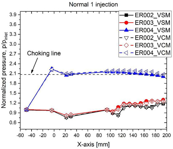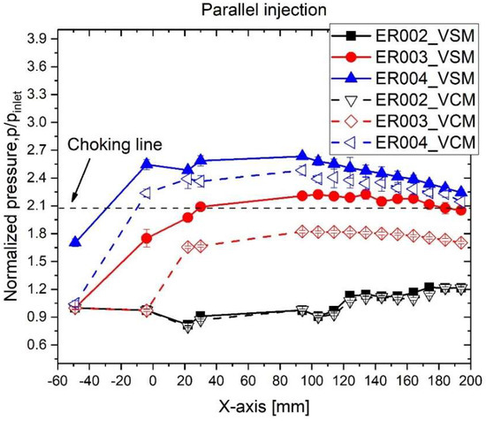 If the combustion pressure increment exceeds unity in Figure 14, the combustor enters the thermal choking condition and the shock train is developed in the isolator. In the one-dimensional Rayleigh flow condition [17], the heat addition (or equivalence ratio) required to choke the flow is dependent on the inflow total temperature. For instance, if the inflow total temperature is about 1047 K, which corresponds to a flight Mach number of 4 [18], the equivalence ratio of hydrogen gas for choking at the constant duct exit is about 0.1 [19,20]. In our case, the inflow air is not hot enough to be combustible but instead is ambient air, so the equivalence ratio for choking the flow is about 0.03 for the inflow total temperature of 296 K. In this sense, for ER = 0.03, thermal choking begins in the case of the parallel injection for the three mixer models. This indicates that the hydrogen is mostly burned in the combustor and the combustion efficiency is high. In the mixing test, the remaining hydrogen volume of the normal 1 injection of the two vent mixers is secondary to the parallel injection in Figure 3. Therefore, for ER = 0.04, the combustion pressure increments of the normal 1 injection for the two vent mixers go beyond unity, as shown in Figure 12. All injection cases show thermal choking in the combustor for ER = 0.06.