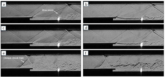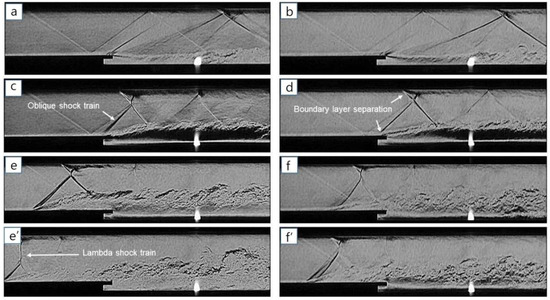 The isolator of the duct-type combustor is designed using Billig’s formula, and the pressure ratio (Pout/Pin) is about 2:1 in our case. A pressure ratio above 2:1 indicates that the flow is thermally choked, as shown in Figure 7. The thermal choking means that, for supersonic flow, heat addition causes the decrease of the Mach number towards unity [17]. For ER = 0.02, the combustion pressure distributions of the VSM and the VCM show the same pattern, which matches the hydrogen concentration distribution in the mixing test, shown in Figure 5a. As the ER increases, the VSM has a higher combustion pressure than the VCM. The combustion can be held in the hot region for forced ignition under the cold flow condition. For our case, hydrogen was burned in the PJ and not ignited in the cold main flow. In this sense, for the same ER, the VCM scatters the hydrogen more toward the span-wise direction so that it is not burned by the PJ compared with the VSM. For ER = 0.02, the combustion is very weak, so the upstream pressure of the PJ is not affected, and the recompression shock can be still seen, as shown in Figure 8a,b. For ER = 0.03, the combustion becomes stronger and induces boundary layer separation around both the vent mixers, as shown in Figure 8c,d. The combustible region is restricted around the lower wall with the hot source due to the cold main flow. For this reason, boundary layer separation first develops from the lower wall and then the upper boundary layer separation follows, which contributes to the asymmetric oblique shock train. The pressure ports in the isolator are embedded on the upper wall. The combustion pressure of the VSM is higher than that of the VCM, as shown in Figure 7. The oblique shock train of the VSM is strong and the upper boundary layer separation goes close to the isolator outlet, as can be seen in Figure 8. For ER = 0.04, the VSM shows the unstart condition. The pressure increases in the nozzle outlet and all pressure ratios exceed 2:1, as seen in Figure 7. Under the unstart condition, the shock train intrudes into the nozzle exit and the downstream flow becomes subsonic. However, in the suction-type test facility, the main flow recovers to supersonic flow due to the vacuum suction, which comes to be the unstart again. This process is quickly repeated, as shown in Figure 8e,e′. The oblique shock train goes toward the nozzle exit, as shown in Figure 8e. After the shock train intrudes into the nozzle, the lambda shock train can be seen, as shown in Figure 8e′. For the VCM, the shock train displays upstream and downstream movements in the isolator and does not go into the nozzle, as shown in Figure 8f,f′.