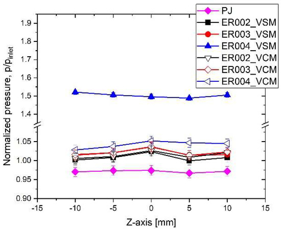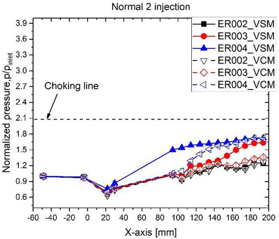 In Figure 11, for the normal 2 injection, there is no thermal choking for all ER ranges. For ER = 0.02, both the vent mixers show the same combustion pressure pattern. For ER = 0.03, the VSM is superior to the VCM in the downstream combustion pressure. In Figure 12, the recompression shock is observed in all figures, and the downstream jet plume fluctuates intensely according to the ER increase. The span-wise combustion pressure measured from span three is displayed in Figure 13. The PJ without combustion shows a flat pressure distribution. For ER = 0.2 and 0.3, the weak combustion has a somewhat high pressure in the center region relative to the surrounding pressures. This is considered to be owing to combustion only occurring weakly in the PJ. As mentioned earlier, the normal 2 injection supplies most of the hydrogen gas into the cold main flow, so it will not be burned by combustion. Because of this, combustion occurs just in the jet plume, due to the small quantity of hydrogen gas. As the injection rate increases, the span-wise combustion pressure rises evenly.