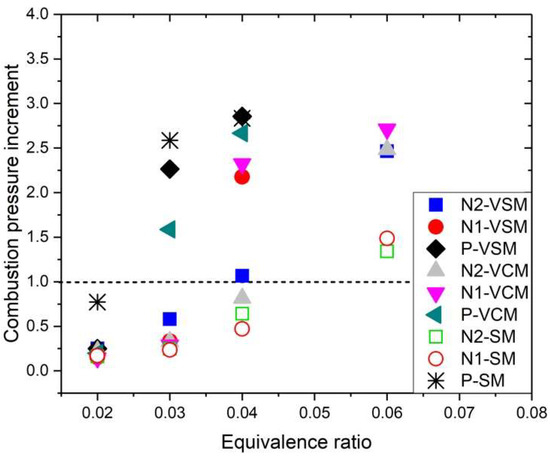 In order to compare the overall combustion performance, each combustion pressure difference between the combustion pressure (Pcom) and the pressure without combustion (PPJ) is summarized and normalized by the total pressure (Ptotal). The combustion pressure increment (ΔP) is evaluated by: