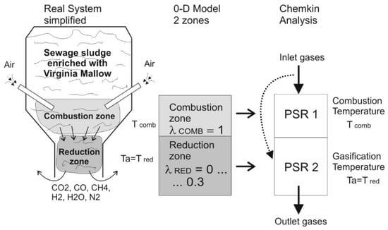 - The gasification and combustion zone is not delimited (the 0-dimensional model was implemented). Both gasification and combustion take place simultaneously in the entire volume (Figure 2).