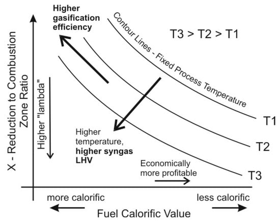 - X ratio was introduced for evaluating gasification process and determine gasification temperature from modeling. X ratio is strictly associated with fuel calorific value and affects process temperature.