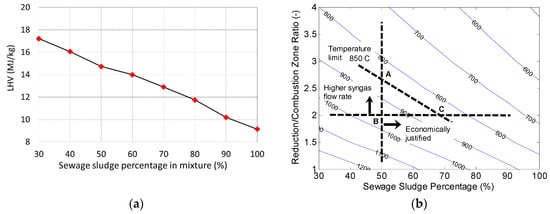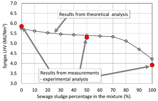 - X minimal limit for effective gasification of the mixture sewage sludge-Virginia Mallow was set to 2. At 50/50% percentage of sewage sludge and Virginia Mallow it provides satisfactory conditions to obtain maximal temperature at gasification zone of 850 °C, what leads to generate syngas with calorific value LHV of 5.3 MJ/Nm3.